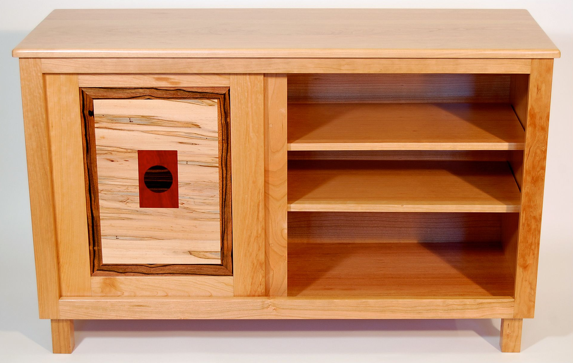 Description: This cherry credenza has an inlaid maple border on the top, adjustable shelves and a sliding door featuring a unique design in Macasser Ebony, Ambrosia Maple and Bloodwood.