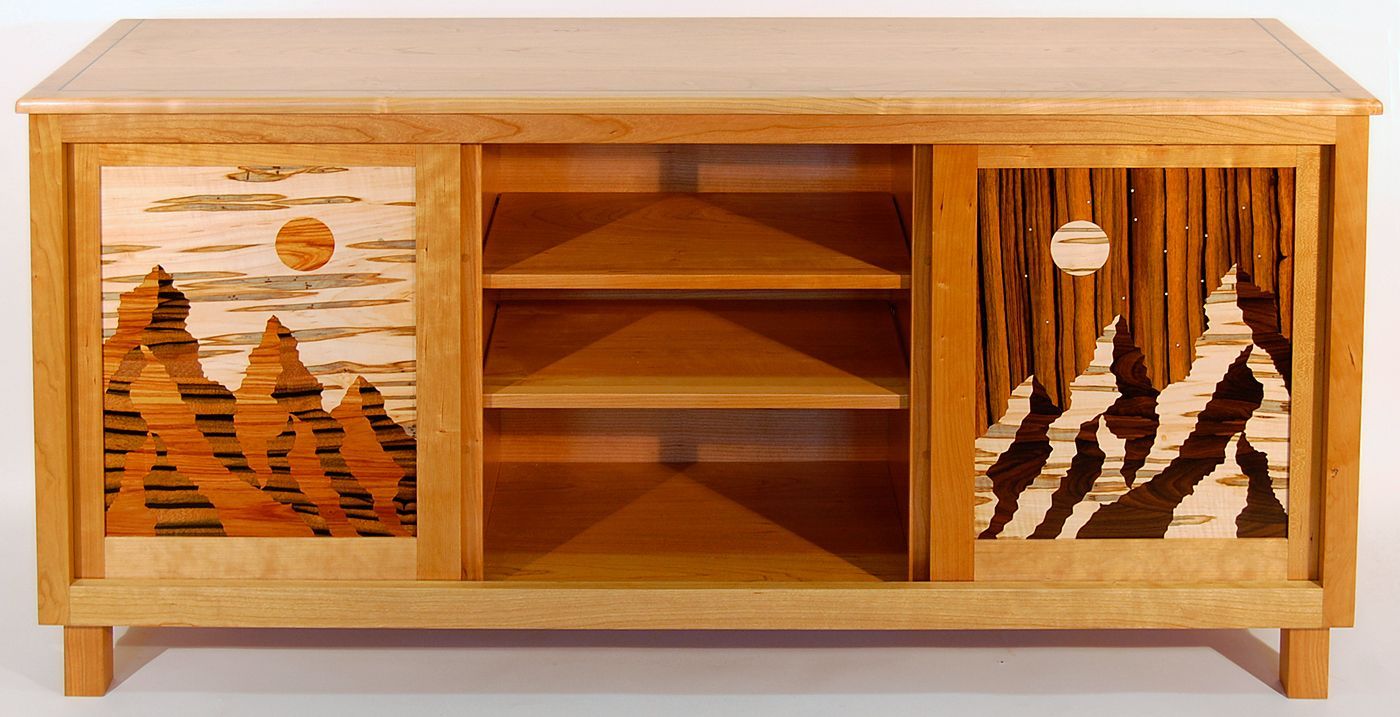 The doors are inlaid with Ambrosia Maple, Macasser Ebony, Zircote and Tulipwood and decorated with metal stars to reflect day and night designs.