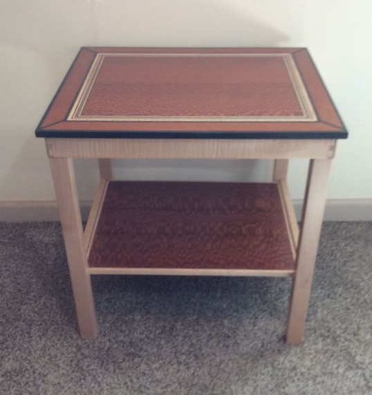 Lacewood End Table accented with maple and ebony bandings and edge design. Featuring a lacewood shelf and dovetailed maple frame. size: 24" L x 20" W x 24" H