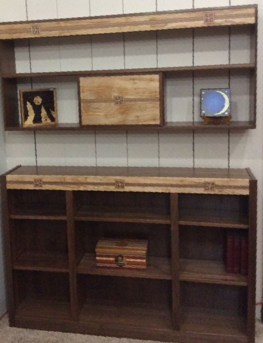 (1) 36 in. H x 41-3/4 in. W x 10-1/2 in. D Cherry Bookcase with inlaid ebony and maple dentile and unique ebony and maple block designs.