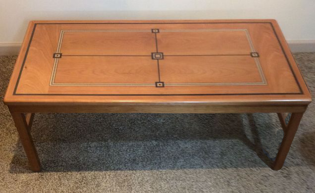 Cherry coffee table accented with maple and ebony bandings and featuring an ebony border and unique ebony and maple inlaid designs. Size: 48" L x 24" W x 17" H
