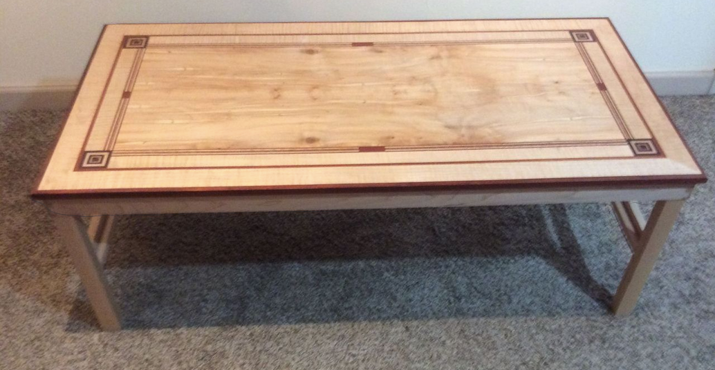 Ambrosia maple and tiger maple coffee table accented with bloodwood and tiger maple featuring distinctive maple and bloodwood bandings and unique bloodwood and maple inlaid designs on a dovetailed maple frame. 48" L x 24" W x 17" H