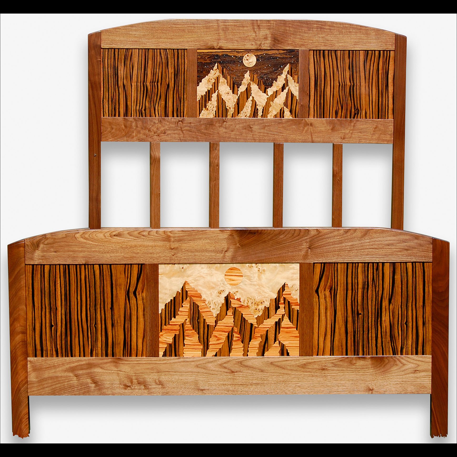 Walnut Queen Bed. The headboard features an inlaid design in Zircote, Mappa Burl and Macasser Ebony. The footboard design is inlaid with Mappa Burl, Macasser Ebony and Tulipwood.